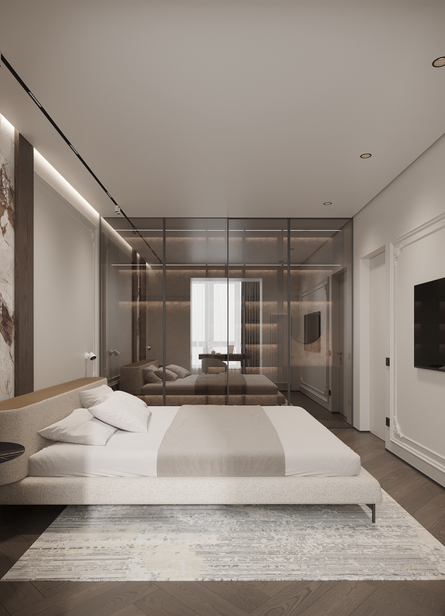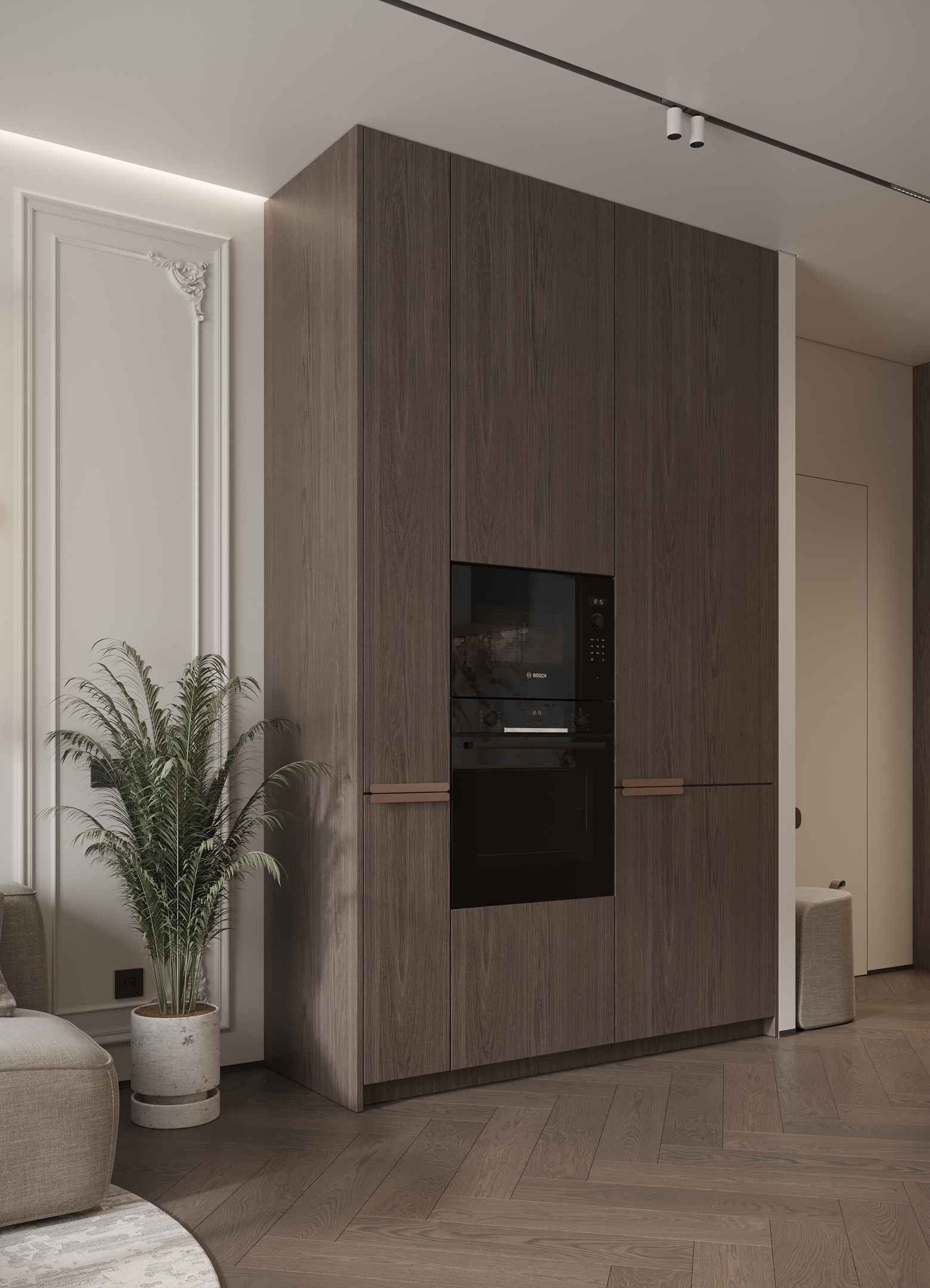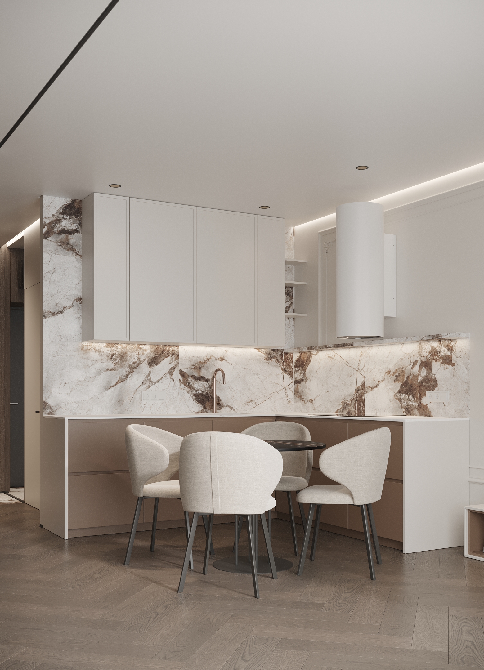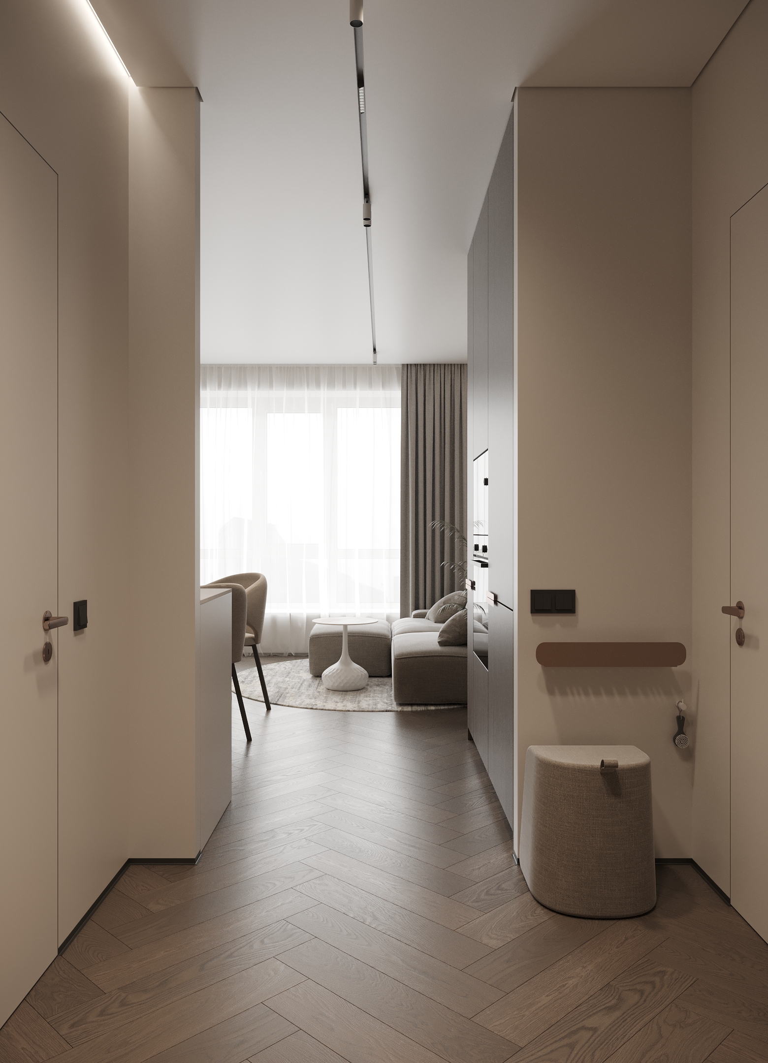 Преміальний житловий простір, наповнений теплом і вишуканістю. Інтер’єр витриманий у карамельній палітрі з легким ароматом теплого цукру, у поєднанні з натуральним каменем та деревом, що створює відчуття м’якої, затишної розкоші. Чисті лінії та сценарне освітлення формують атмосферу спокою, статусу й позачасової елегантності.